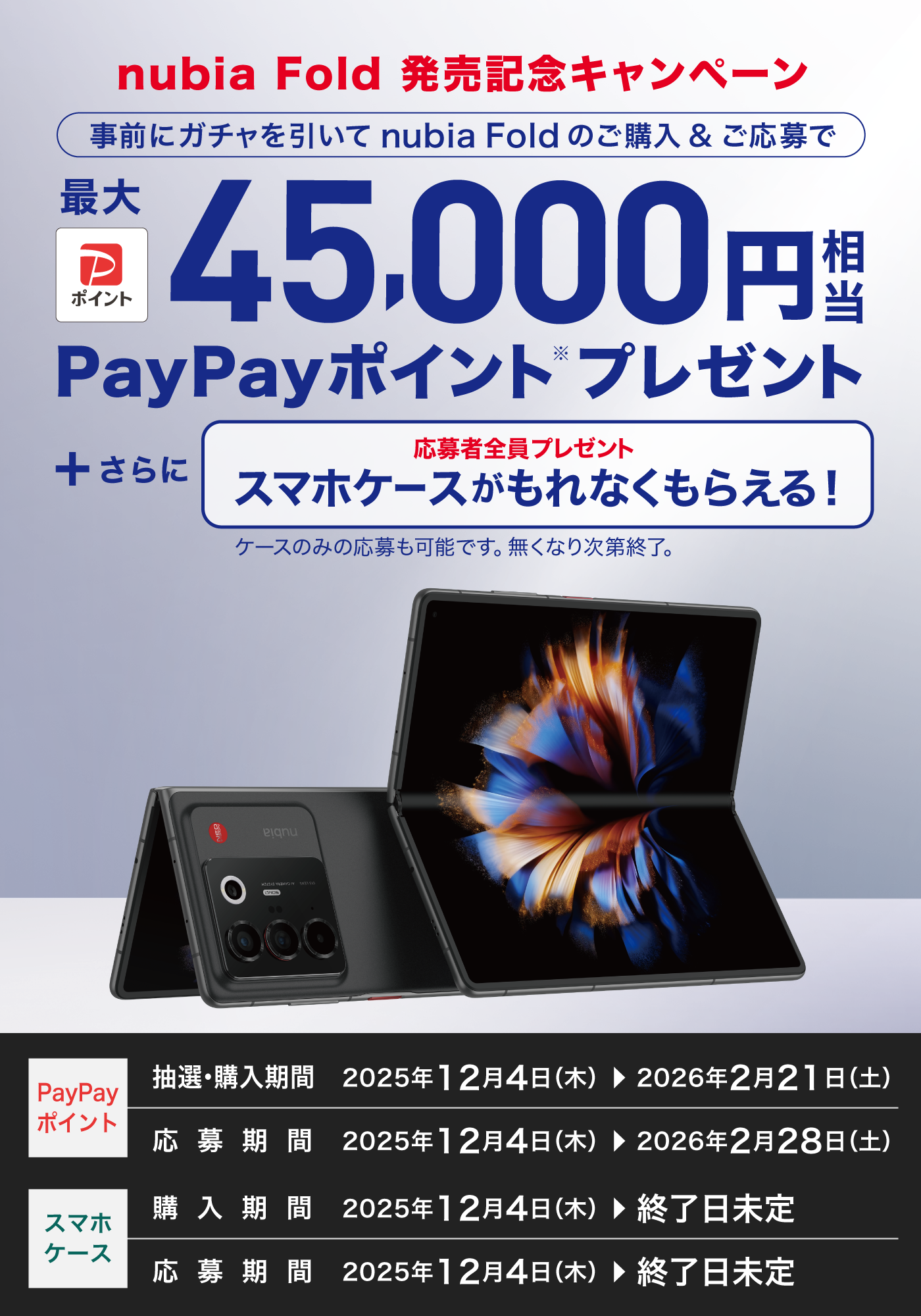 - ・キャンペーン期間内にワイモバイルでnubia Foldをご購入した方が、本キャンペーン応募対象となります。(機種変更でのご購入もキャンペーンの対象となります。)